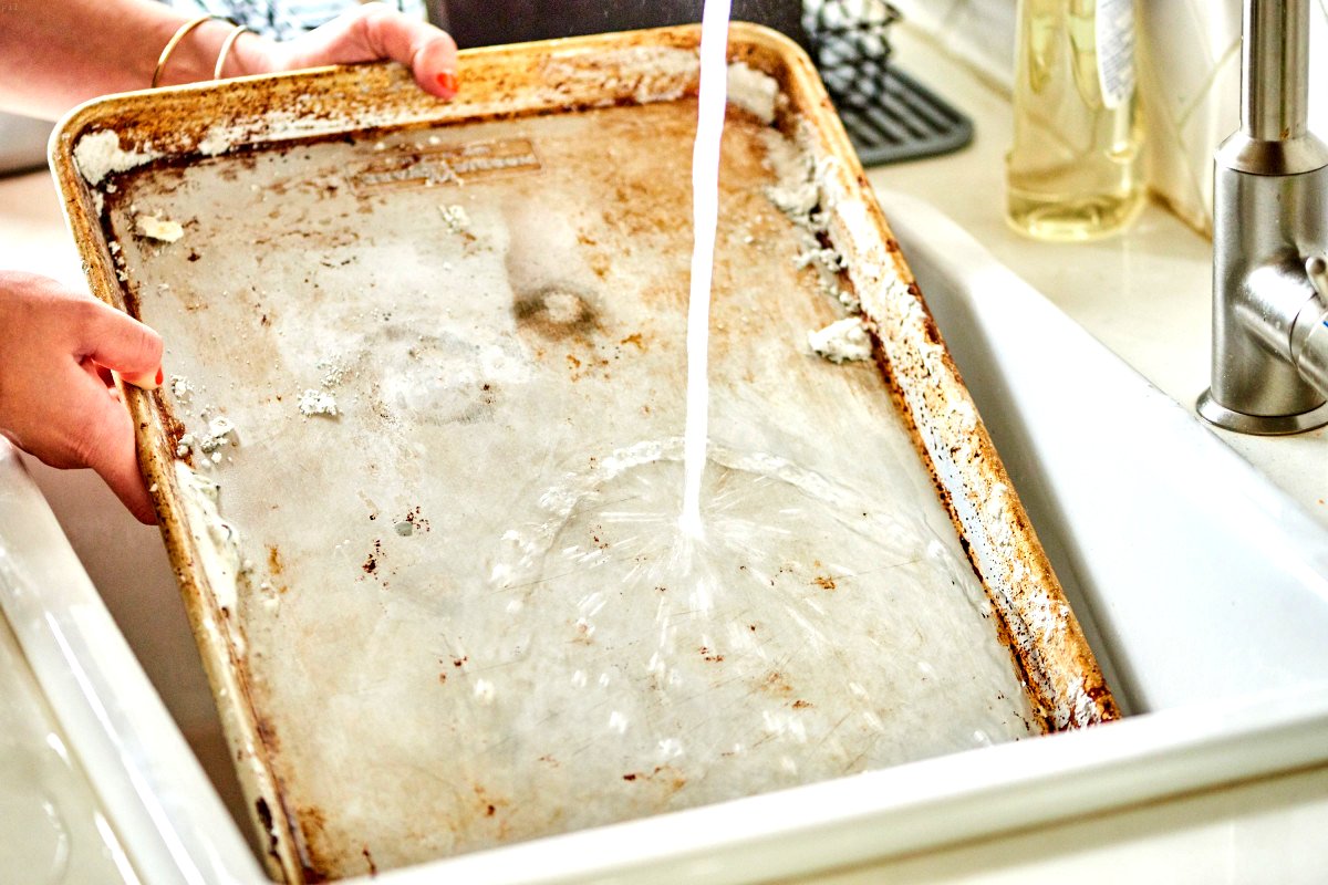 - Togliere la piastra dal forno e inumidirla con acqua calda.
